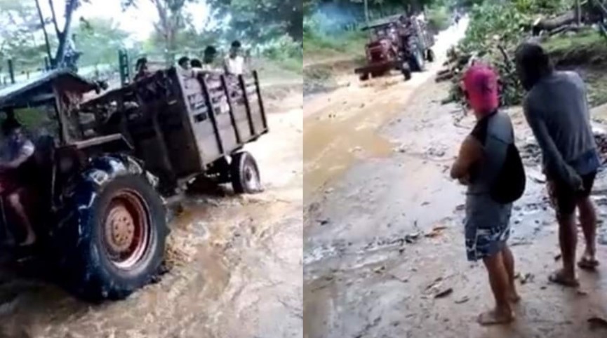Varios estudiantes realizan una peligrosa travesía encima de un tractor para llegar al colegio, único medio que puede atravesar los pésimos caminos de la zona. Los jóvenes arriesgan sus vidas.