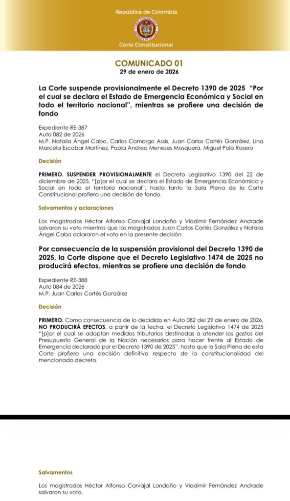 La Corte Constitucional informó en un comunicado que decidió suspender provisionalmente el Decreto 1390 de 2025, “por el cual se declara el Estado de Emergencia Económica y Social en todo el territorio nacional”, mientras se adopta una decisión de fondo.