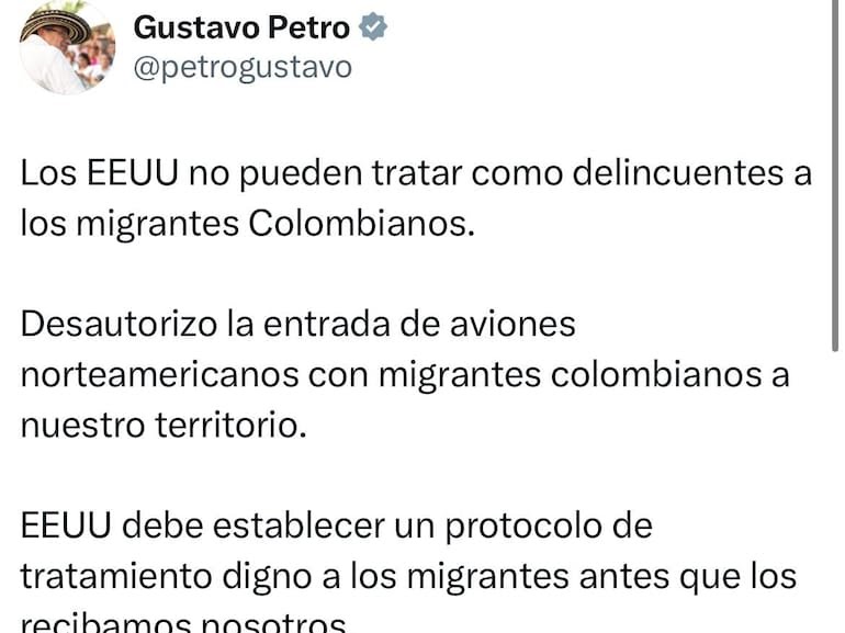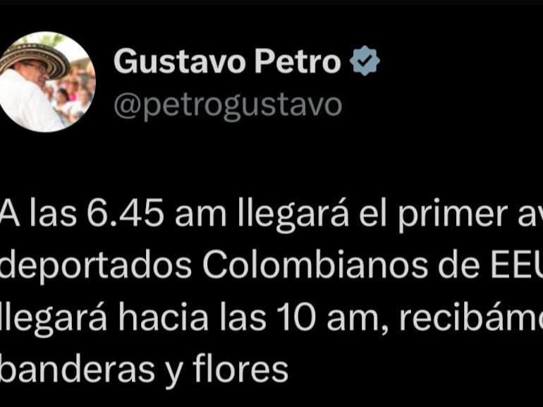 Antes del trino cuestionando las acciones de Estados Unidos y desautorizando la llegada de los vuelos con deportados al país, Petro envió un mensaje indicando la llegada de estos vuelos e invitó a las personas a recibirlos “con banderas y flores”.
