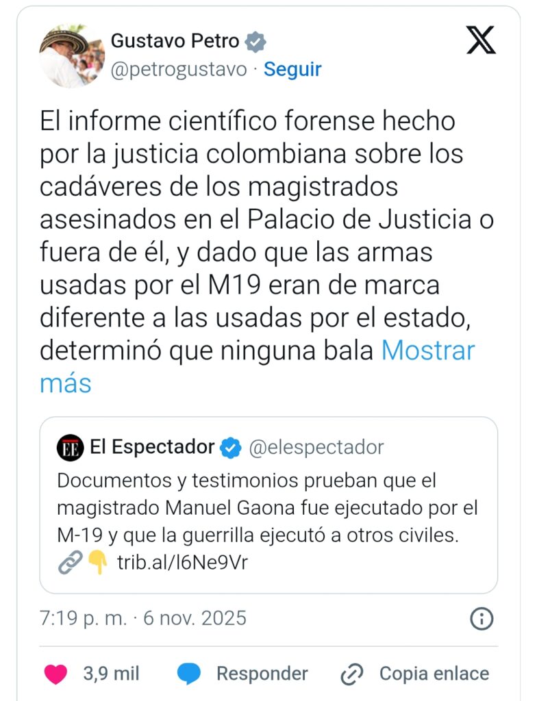 “El informe científico forense hecho por la justicia colombiana sobre los cadáveres de los magistrados asesinados en el Palacio de Justicia o fuera de él, y dado que las armas usadas por el M19 eran de marca diferente a las usadas por el estado, determinó que ninguna bala proveniente de armas del M19 se encontró en los cuerpos de los magistrados asesinados en el Palacio”, escribió Petro en su cuenta en X.