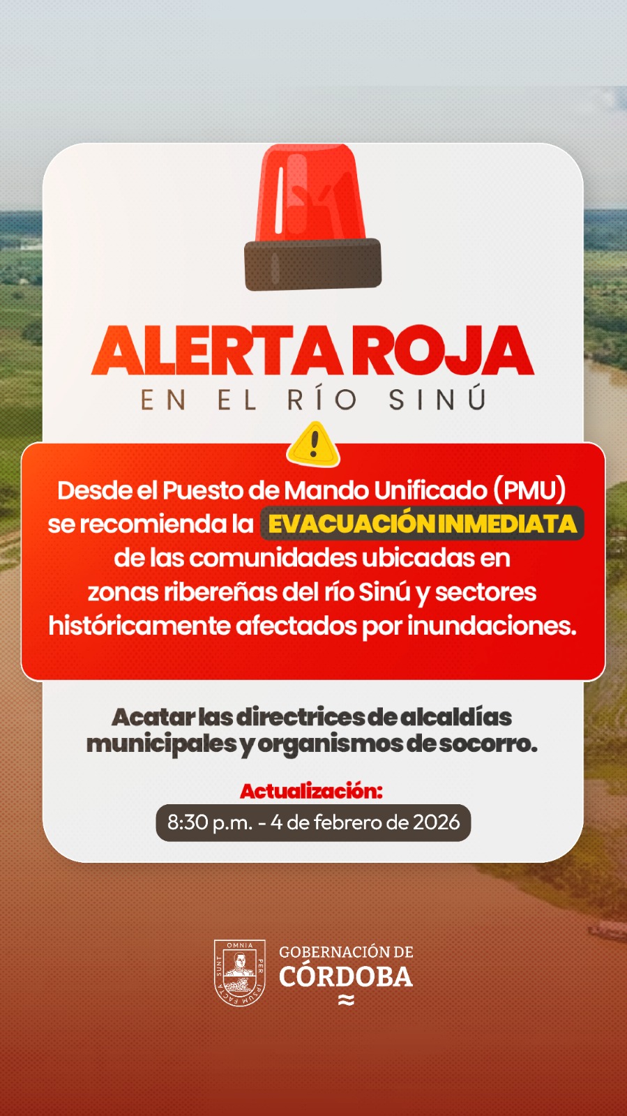 Montería, 04 de febrero de 2026. – Desde el Puesto de Mando Unificado (PMU) de Córdoba se informa que se mantiene la ALERTA ROJA en el departamento debido a la situación crítica por los niveles que registran las cuencas de los ríos Sinú, San Jorge y Canalete, como consecuencia del evento climático atípico desde el pasado domingo.