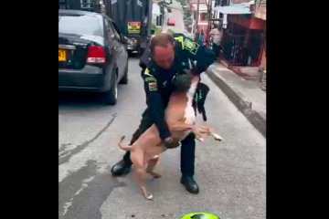 En un video que circula por redes sociales se ve cómo un policía intenta zafarse durante casi un minuto de un perro de raza pitbull que lo tiene agarrado del antebrazo y a pesar de varios esfuerzos sigue mordiendo al uniformado cuyo rostro es de evidente dolor y desesperación.