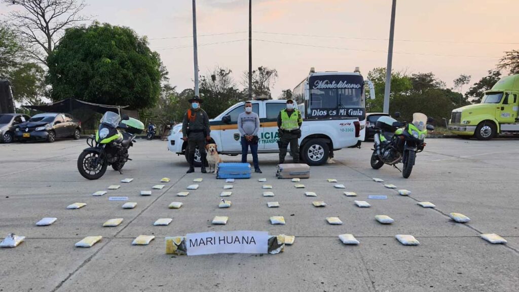 En desarrollo de actividades de control adelantadas por la Seccional de Tránsito y Transporte de la Policía, se realizó la captura de un hombre de 40 años de edad al ser sorprendido transportando 40 kilos de marihuana en un bus de servicio público.