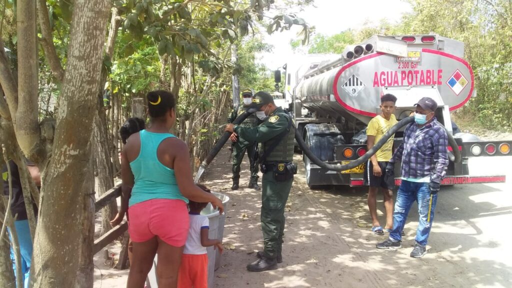 San Bernardo del Viento, Córdoba. La falta de agua potable en varios municipios de Córdoba, está provocando una emergencia social, por eso la Policía Nacional en conjunto con las administraciones municipales, ha venido mitigando el impacto, a través de la entrega del preciado líquido especialmente en la zona rural.