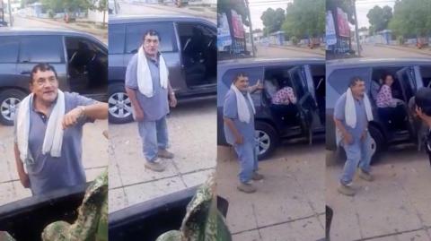 Esta vez fue captado con imágenes de un teléfono celular, cuando a bordo de una camioneta de alta gama hace parada en un retén militar, saluda a los soldados y comienza a hacer bromas con ellos.