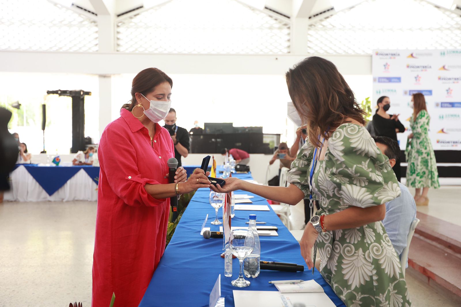 Montería, 7 de septiembre de 2021- La Primera Dama, María Juliana Ruiz quien lidera la red de tejido social LUNNA (Líderes Unidos por los Niños, Niñas y Adolescentes), durante su participación en la Primera Cumbre de Gestoras Sociales de las ciudades capitales, hizo entrega de la medalla que representa el programa a la Gestora Social de Montería, Antonella Vega como compromiso de seguir trabajando en la región bajo este propósito.