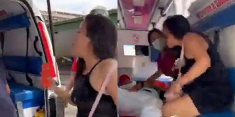 En el video se observa cómo un hombre, aparentemente herido, ya se encuentra recostado en la camilla de una ambulancia cuando su novia celosa le arma el escándalo.