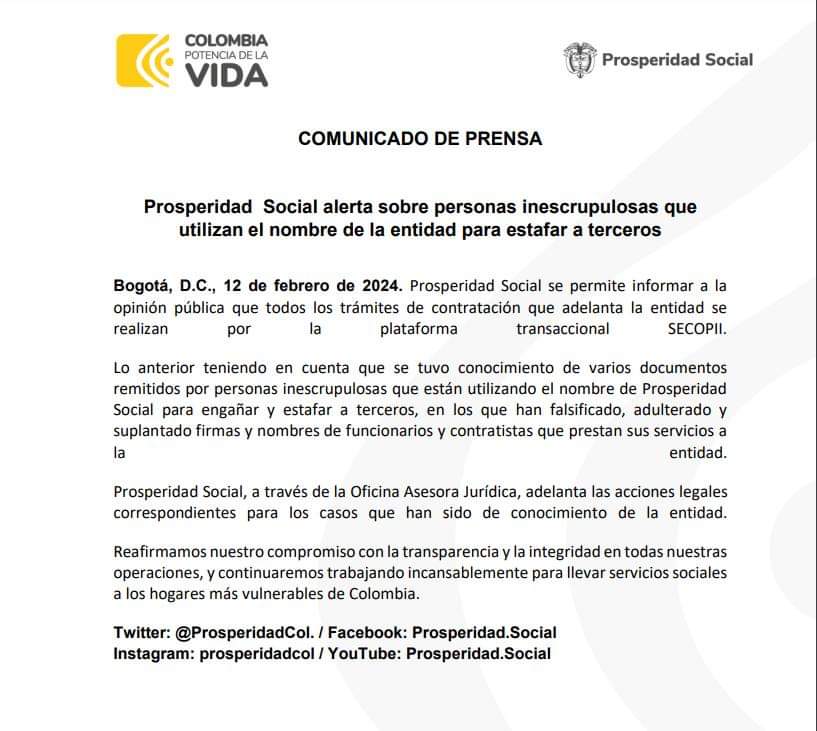 Lo anterior teniendo en cuenta que se tuvo conocimiento de varios documentos remitidos por personas inescrupulosas que están utilizando el nombre de Prosperidad Social para engañar y estafar a terceros, en los que han falsificado, adulterado y suplantado firmas y nombres de funcionarios y contratistas que prestan sus servicios a la entidad.