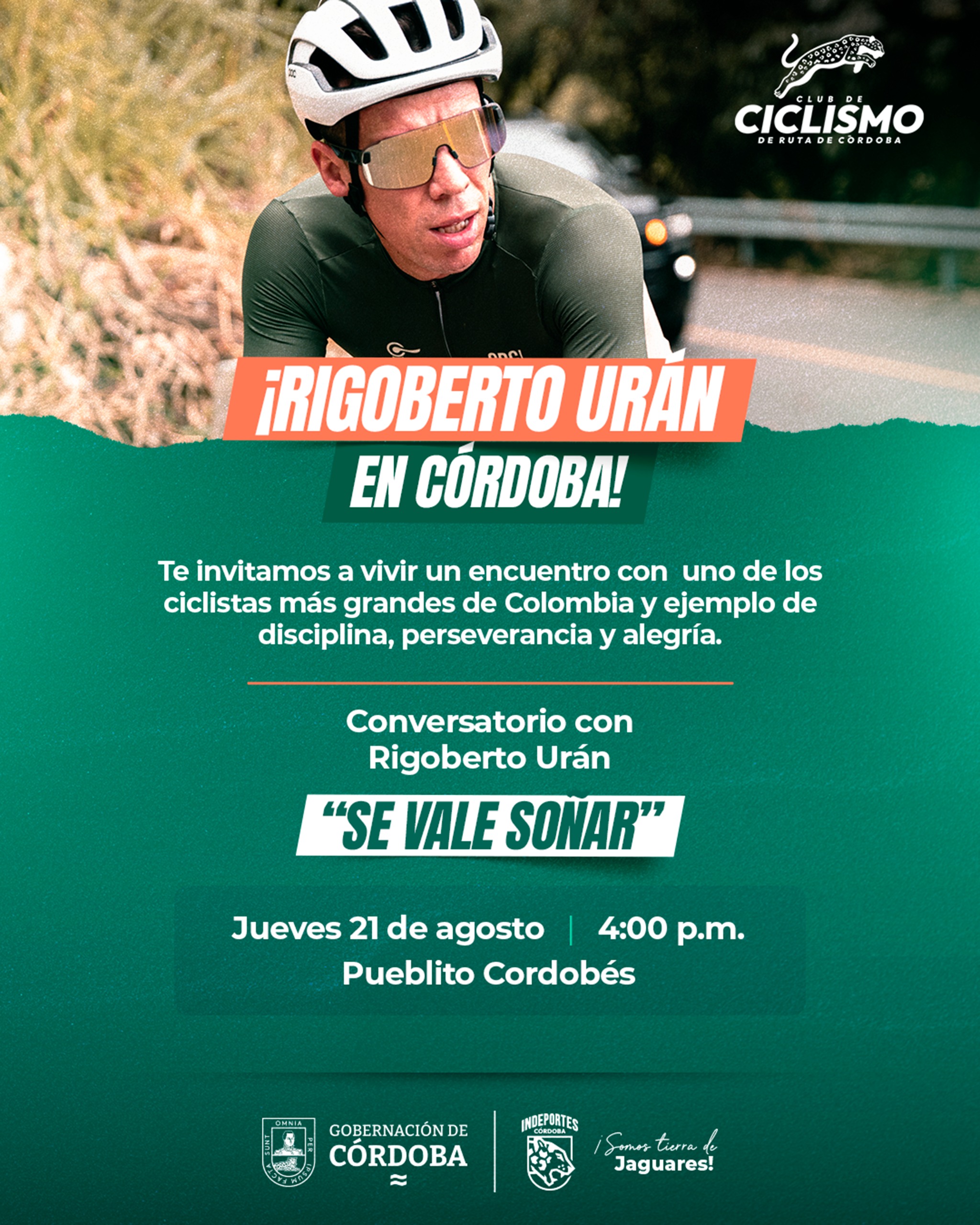 “Este jueves tenemos una cita muy especial en el Pueblito Cordobés con un invitado de lujo: Rigoberto Urán. Queremos que los cordobeses se acerquen, que escuchen su historia y se inspiren con el mensaje de disciplina, esfuerzo y alegría que él representa. Desde la Gobernación y a través de Indeportes Córdoba seguimos promoviendo espacios que motivan a nuestros jóvenes a soñar en grande y a creer que con dedicación todo es posible. Los invito a que no se lo pierdan, porque será un momento para aprender, reír y sobre todo, para pedalear juntos los sueños de nuestro departamento”, indicó el mandatario departamental.