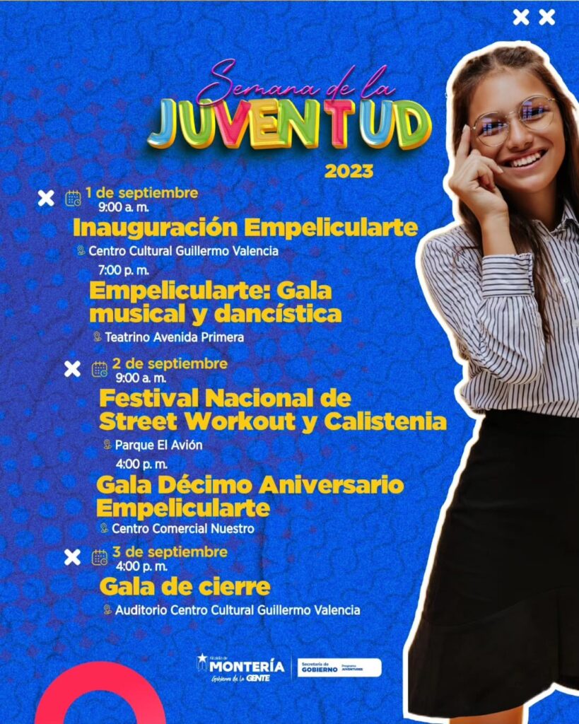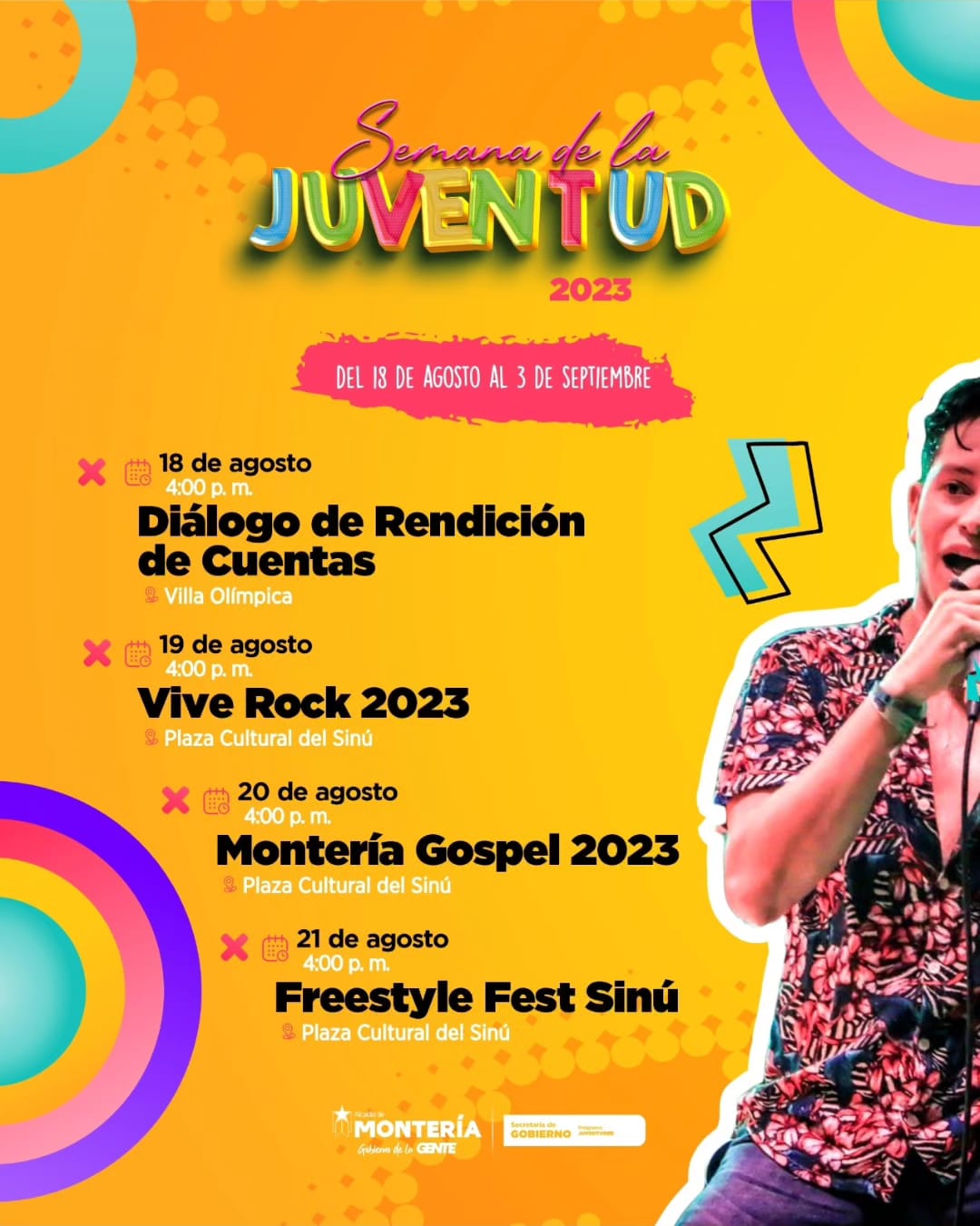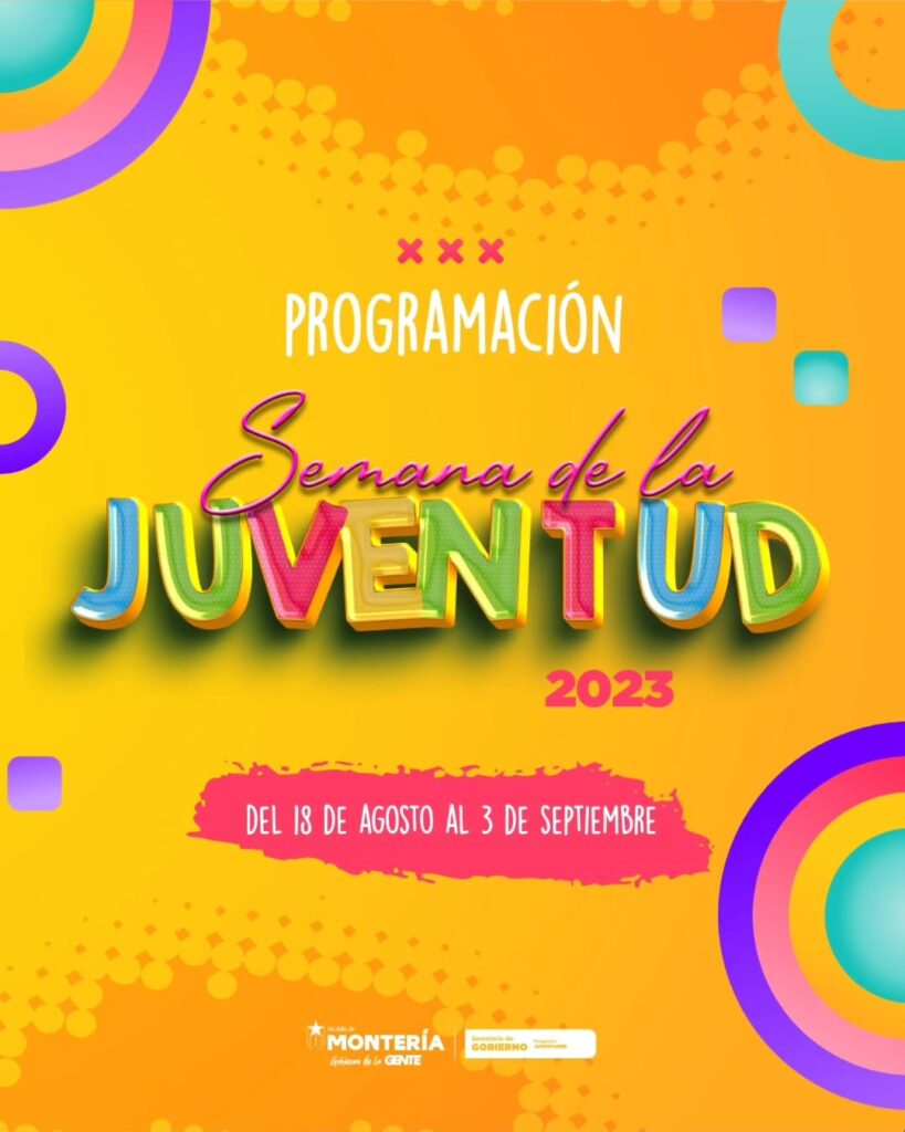 Montería, 8 de Agosto de 2023. Con una variada agenda se realizará la Semana de la Juventud del 18 de agosto al 3 de septiembre, que será una nueva oportunidad para que los jóvenes de la ciudad disfruten de estos espacios.