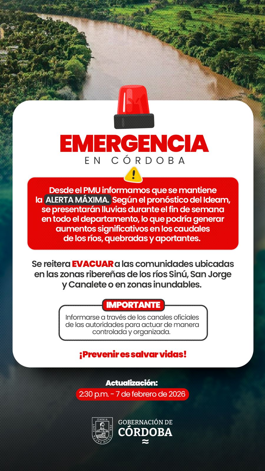 Reiteramos el llamado a la comunidad de EVACUAR y mantenerse informada por canales oficiales y atender de manera inmediata las indicaciones de las alcaldías municipales y organismos de socorro, especialmente en zonas ribereñas y sectores que históricamente han registrado inundaciones.
