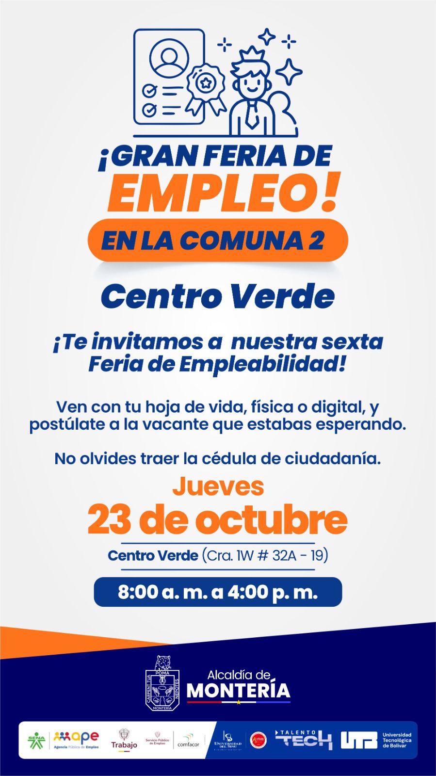 Este jueves 23 de octubre, el Centro Verde será nuevamente escenario de la Gran Feria de Empleo en la Comuna 2, de 8:00 a. m. a 4:00 p. m., donde los ciudadanos podrán postularse a diversas vacantes llevando su hoja de vida, física o digital, y su cédula de ciudadanía.