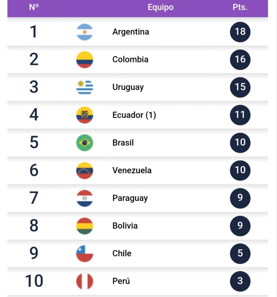 El conjunto nacional, que ha tenido un exitoso proceso bajo la dirección técnica de Néstor Lorenzo, acumula 16 puntos en la tabla de posiciones, unidades suficientes para ubicarse en la segunda casilla por detrás de Argentina (18).