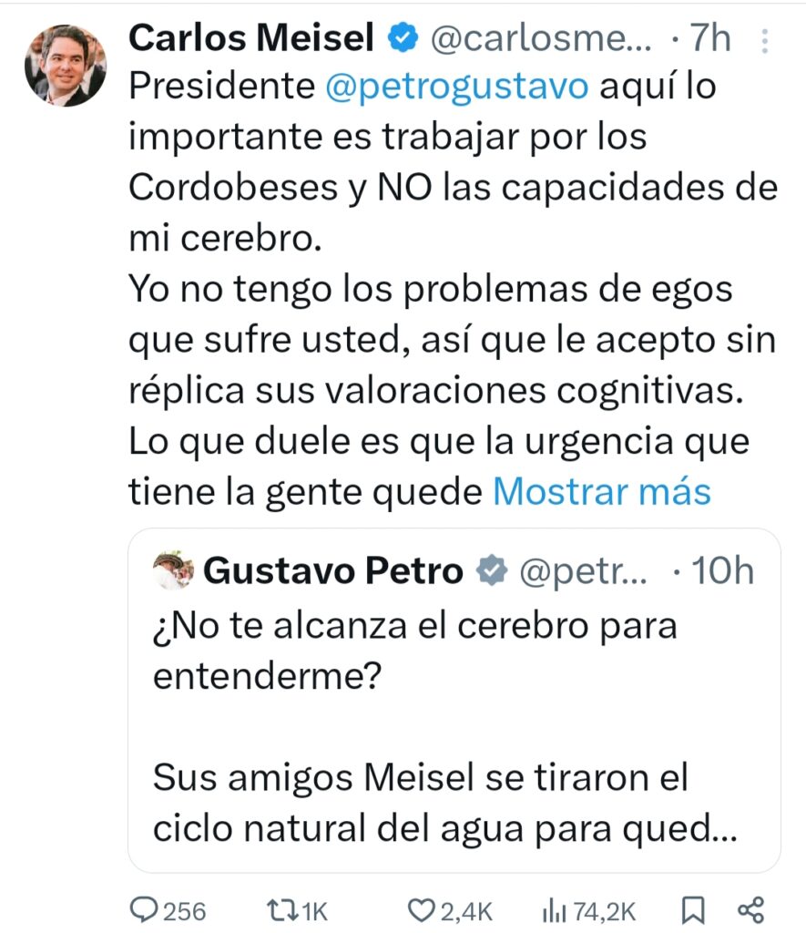 Un fuerte cruce en redes sociales se presentó entre el presidente Gustavo Petro y el senador del Centro Democrático Carlos Meisel, tras las sesiones del consejo de ministros realizadas en Montería, Córdoba, en medio de la emergencia climática que afecta al Caribe colombiano.