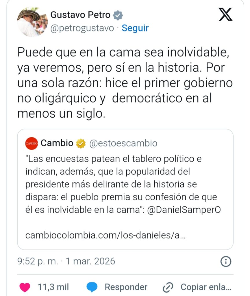 En un mensaje publicado en su cuenta de X (antes Twitter), Petro señaló que puede ser “inolvidable” “en la cama” y también en la historia por su administración. En concreto, afirmó: