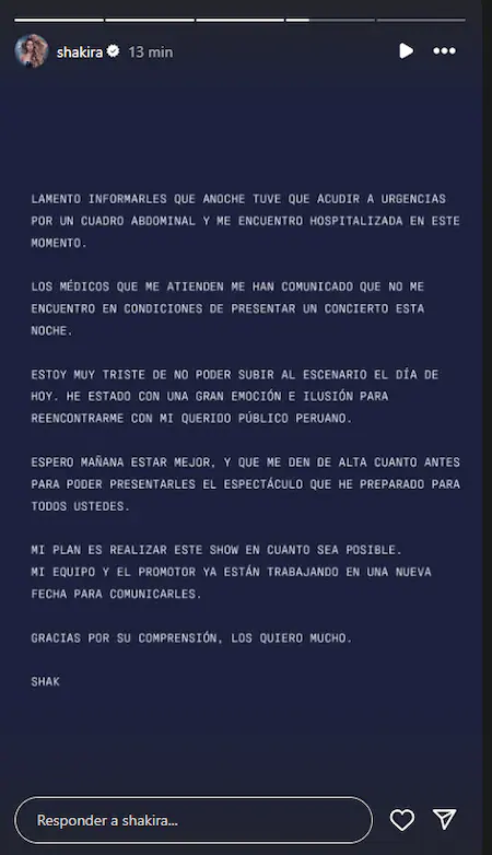 Shakira expresó su tristeza por no poder reencontrarse con su público peruano y aseguró que su equipo ya está trabajando en una nueva fecha para el show. “Espero mañana estar mejor y que me den de alta cuanto antes para poder presentarles el espectáculo que he preparado para todos ustedes”, agregó.