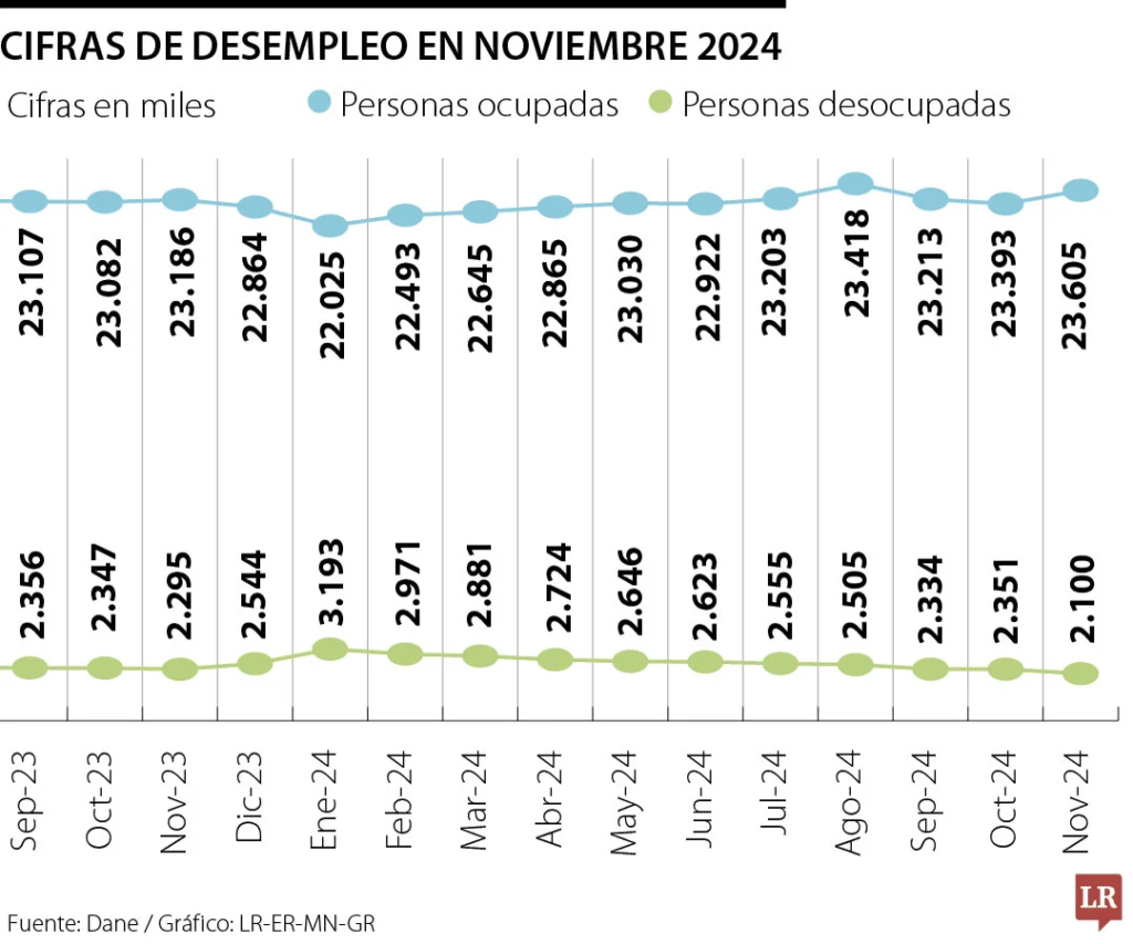 El Departamento Administrativo Nacional de Estadística (DANE) reveló que la tasa de desempleo en Colombia para noviembre de 2024 se ubicó en 8,2%, un descenso significativo frente al 9% reportado en el mismo mes de 2023. Esta cifra marca el nivel más bajo para un noviembre desde 2018, cuando se registró en 7,8%. Según el informe, la población desocupada disminuyó a 2,1 millones, lo que representa 195.000 personas menos respecto al mes anterior. Por otro lado, la población ocupada alcanzó los 23,6 millones, un incremento de 420.000 personas en comparación con noviembre de 2023.