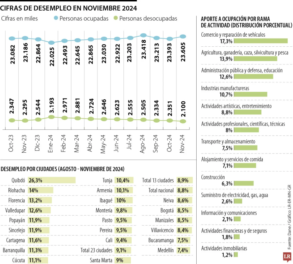 A pesar del progreso general, ciertas ciudades aún enfrentan desafíos importantes en materia de empleo. Quibdó, Riohacha y Florencia registraron las tasas de desempleo más altas del país, mientras que Villavicencio, Bucaramanga y Medellín destacaron por sus bajos niveles de desocupación. Por su parte, ciudades como Montería e Ibagué lograron importantes reducciones en sus tasas de desempleo, consolidando una tendencia positiva en varias regiones.