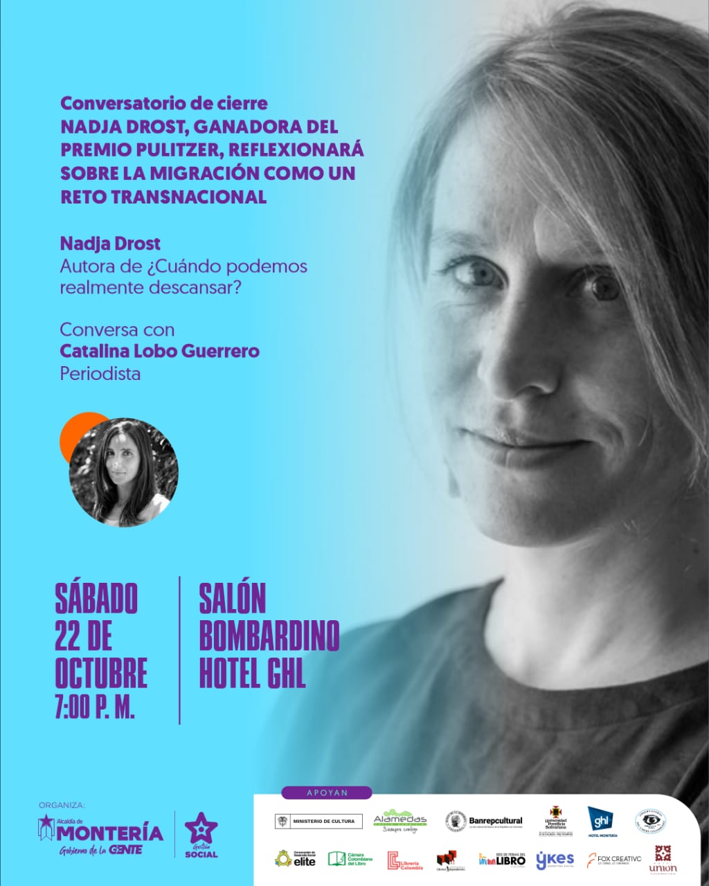 ¿Qué llevan en sus corazones los migrantes? ¿Qué es el coraje y el miedo en medio de la nada, en el corazón de una selva tropical? ¿Qué significa irse? Sobre esto reflexionará Nadja Drost, canadiense ganadora del Premio Pulitzer por su historia ¿Cuándo podemos realmente descansar? Nadja, hoy residenciada en Nueva York, acompañó a un grupo de personas a atravesar el Tapón del Darién, que “se considera una de las rutas de migración humana más largas y peligrosas del mundo”, en la frontera entre Colombia y Panamá. La autora contará, también, cómo ve a Colombia en la distancia. Conversará con la periodista Catalina Lobo-Guerrero. Lugar: Salón Bombardino Hotel GHL.