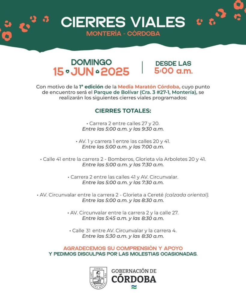 Para el desarrollo del evento deportivo se ha dispuesto cierres viales temporales en varios tramos de la capital cordobesa, por donde transitarán los corredores durante este evento deportivo que da apertura a la fiesta más importante del departamento.