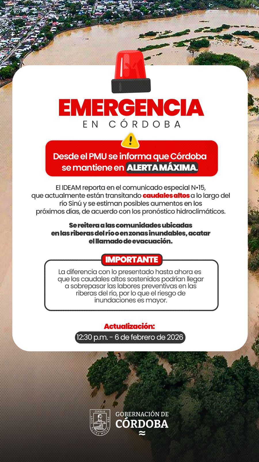 Montería, 6 de febrero de 2026. Córdoba se mantiene en alerta máxima. Desde el Puesto de Mando Unificado Departamental, desde donde se monitorea la evolución del frente frío y otros fenómenos, el IDEAM reportó en el comunicado especial N•15, que actualmente transitan caudales altos a lo largo del río Sinú.