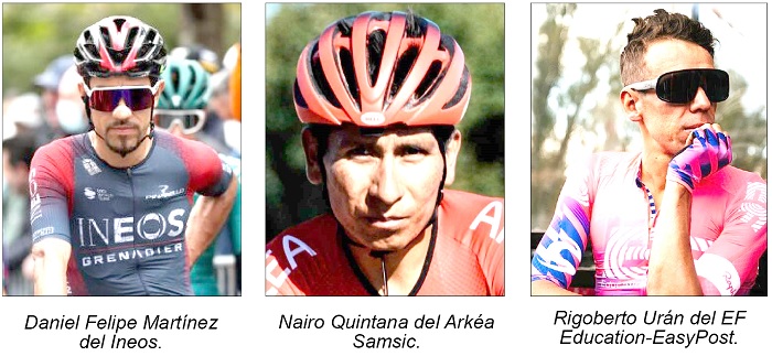Además de Daniel Felipe Martínez, que parte como uno de los líderes del Ineos, disputarán la carrera Nairo Quintana como jefe de filas del Arkéa Samsic y Rigoberto Urán como carta en la clasificación general del EF Education-EasyPost.
