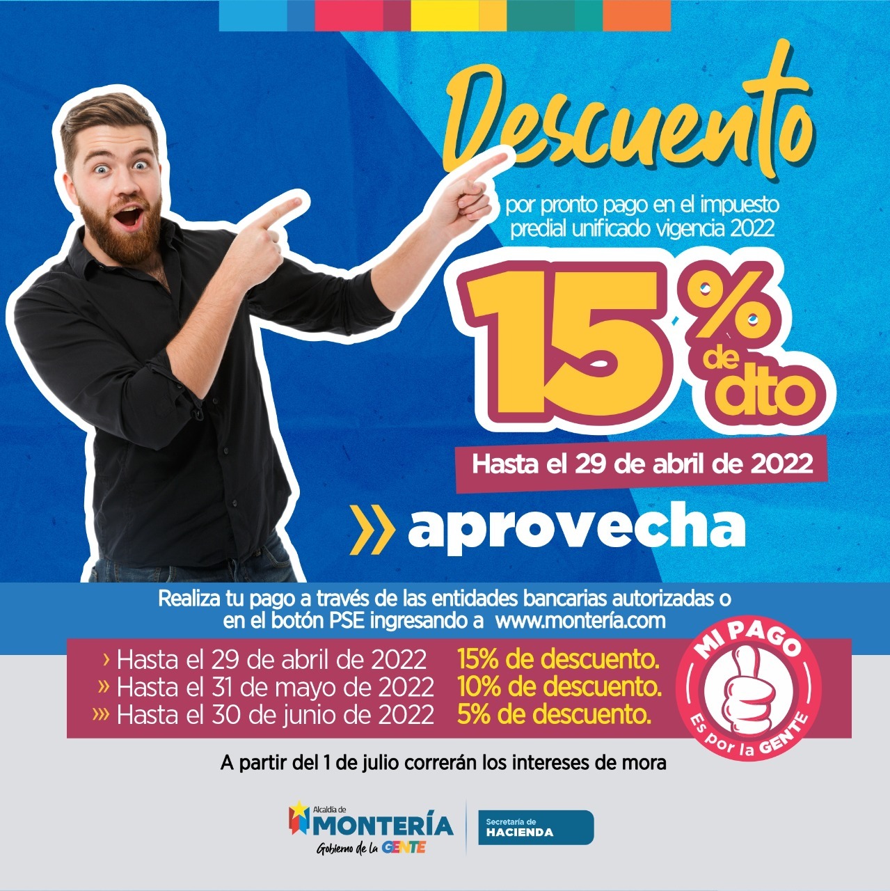 Montería, 28 de abril de 2022 Se acaba el tiempo. Hasta mañana tienen plazo los contribuyentes para aprovechar el descuento, por pronto pago, del 15 % del Impuesto Predial Unificado.