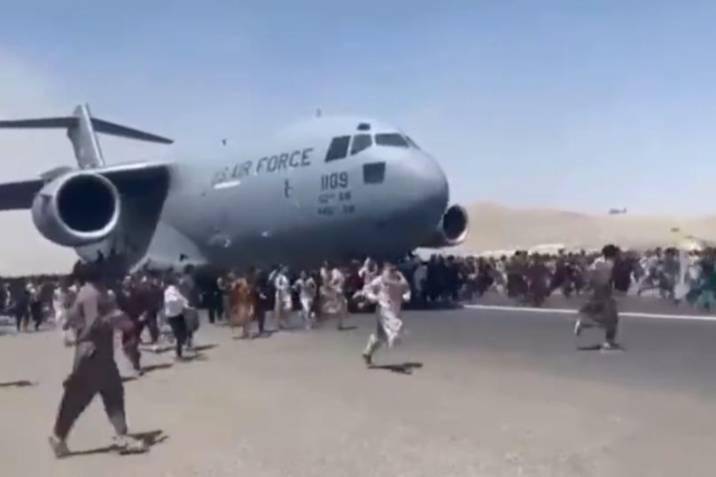 Vídeos difundidos en las redes sociales mostraron un avión militar estadounidense tipo C-17, del que se desprenden varios cuerpos en el aire, lo que, según testigos, se trataba de personas que se aferraron al exterior del avión antes de despegar.
