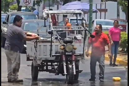 Al ver que el agua no funciona, el dueño del vehículo intenta colocar un trapo mojado sobre el tanque del combustible y justo en ese momento aparece el «héroe» de esta historia.