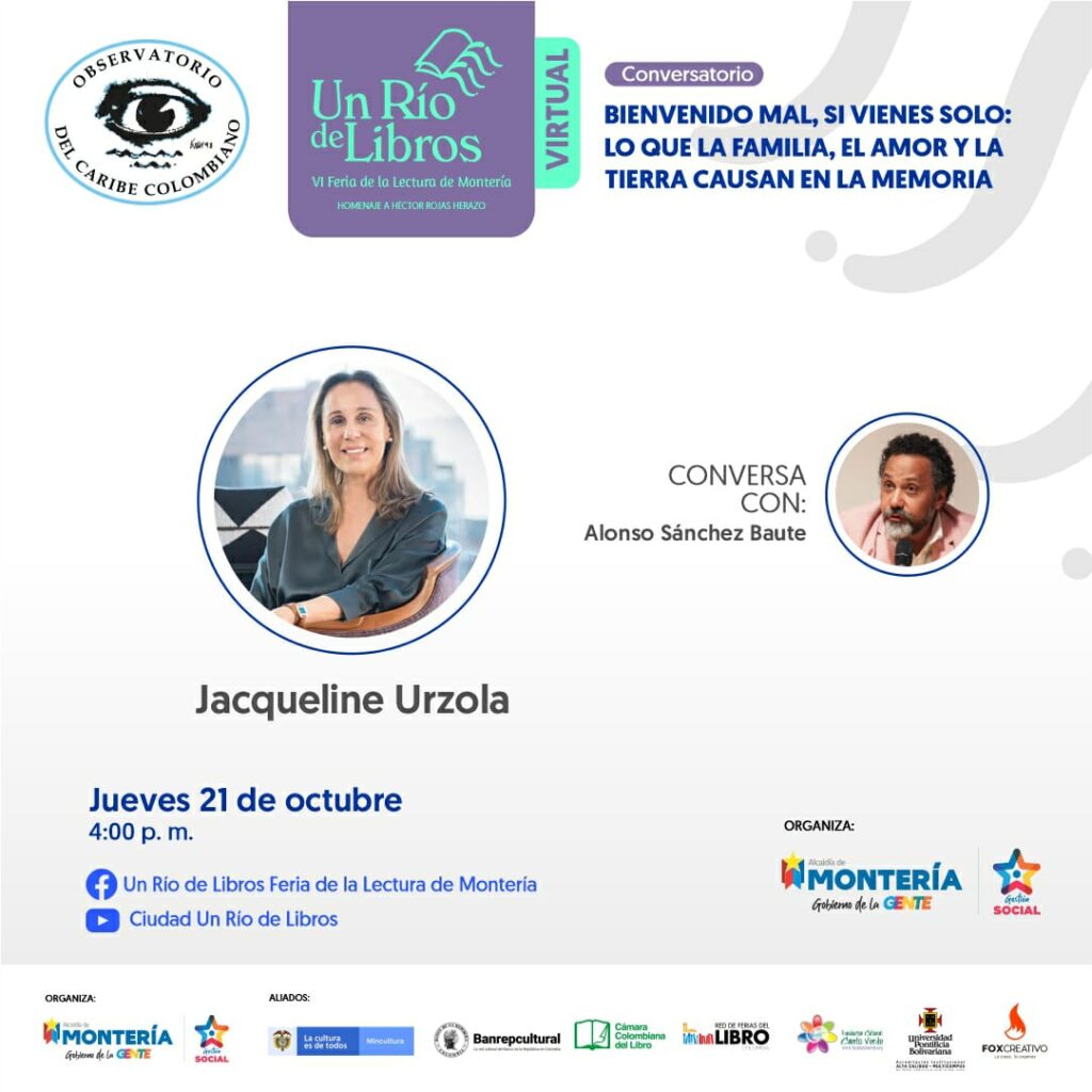 4:00 p. m. Conversatorio Bienvenido mal, si vienes solo: lo que la familia, el amor y la tierra causan en la memoria. Jacqueline Urzola, autora de Bienvenido mal…conversará con Alonso Sánchez Baute.