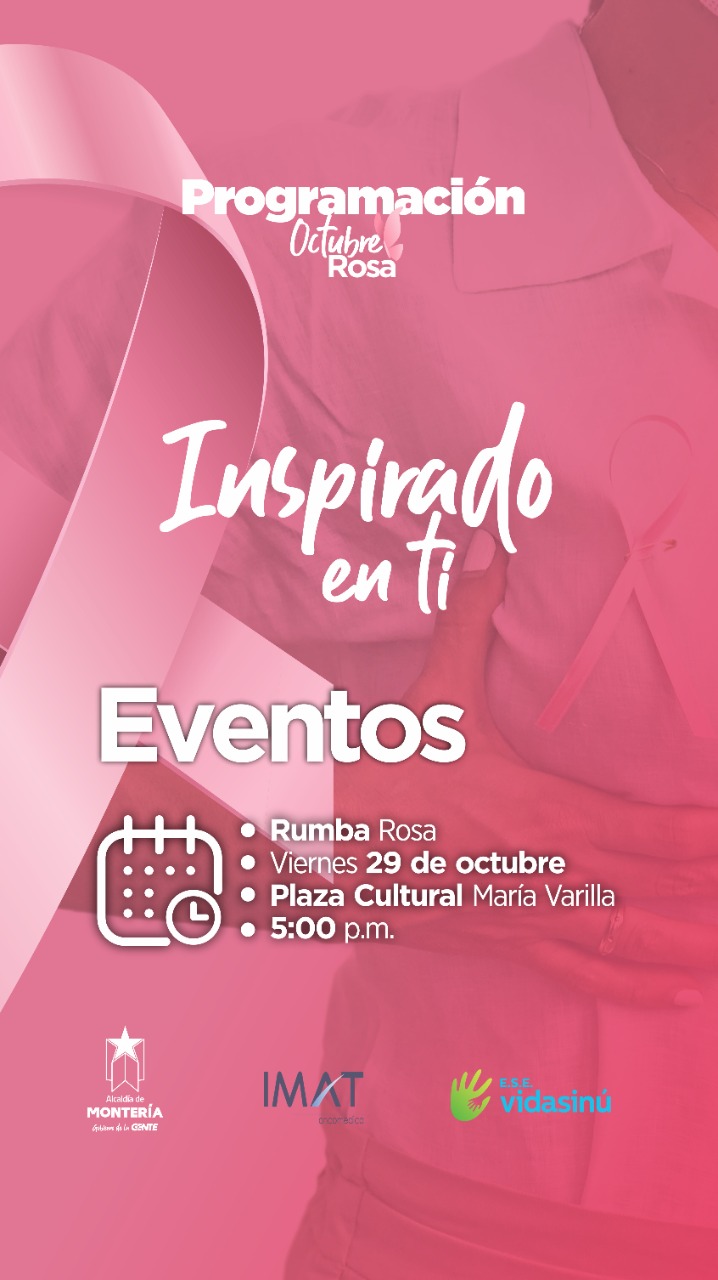 Montería, 27 de octubre del 2021. La alcaldía de Montería a través de la Secretaría de Salud en articulación con Gestión Social y la ESE Vida Sinú, invitan a todas las mujeres de la ciudad a vincularse este viernes 29 de octubre en la actividad denominada “Rumba Rosa” que se realizará en la Plaza Cultural María Varilla a las 5:00 p.m.