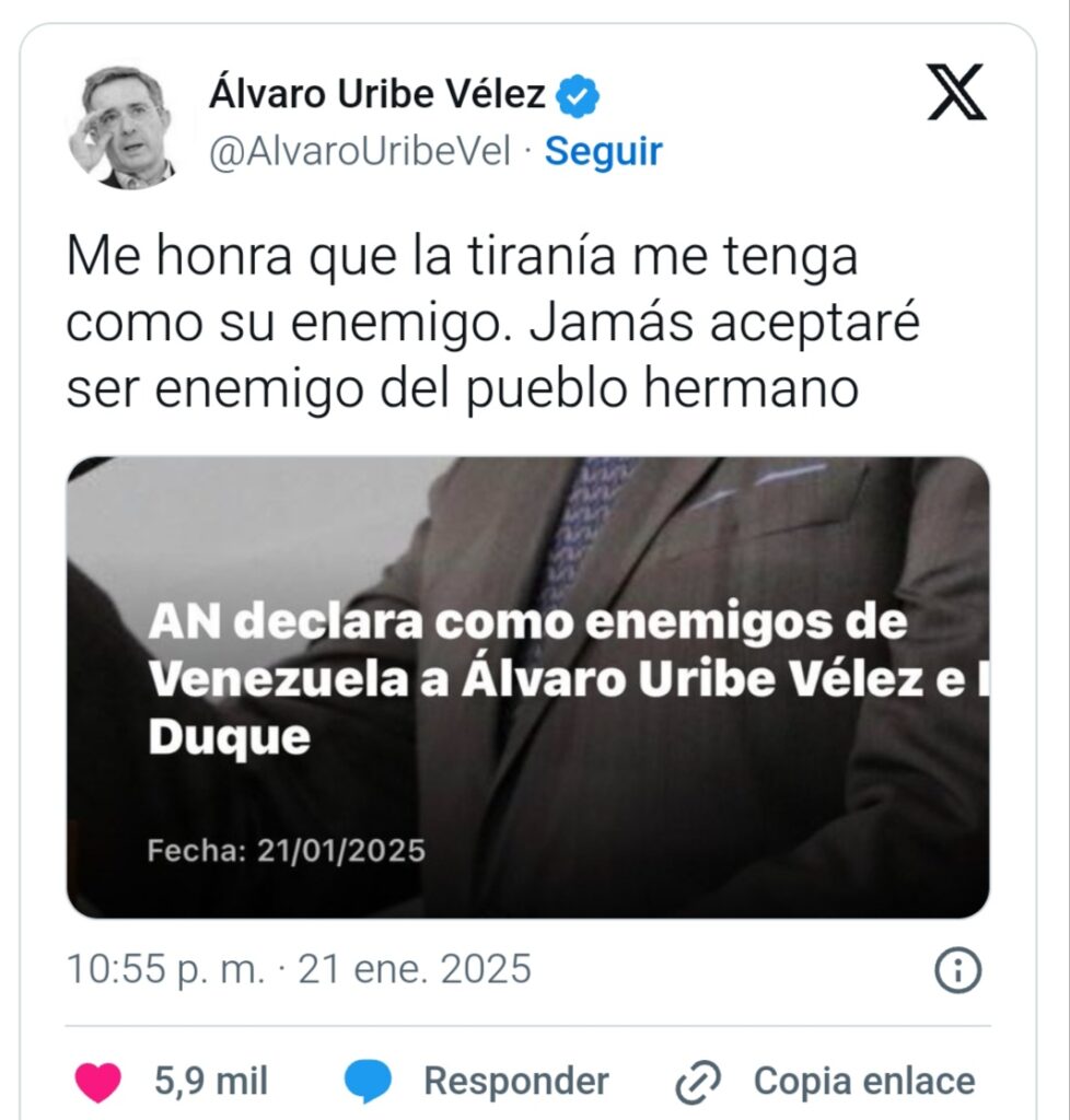 El expresidente colombiano Uribe ha resaltado en redes sociales que “jamás” aceptará “ser enemigo del pueblo hermano”. “Me honra que la tiranía me tenga como su enemigo”, ha sentenciado en un mensaje en el que adjunta una noticia sobre las acciones de la Asamblea.