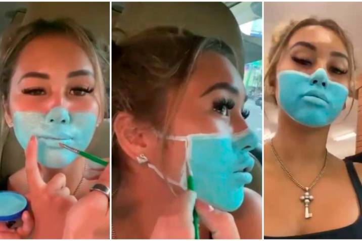 Ante la negativa del guardia, los jóvenes regresan a un coche y el estadounidense pinta de azul los labios y la mitad baja de la cara a su amiga para simular una mascarilla y así consiguen entrar en el supermercado, según muestra el video.